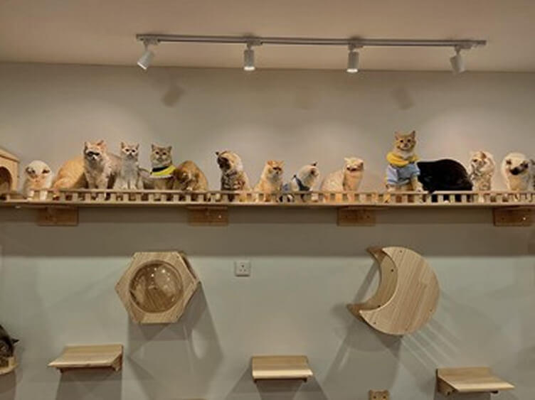 猫ちゃんたちが自由に歩き回り、一緒に遊んだりランチを楽しんだり、コーヒーを飲んだりできます。